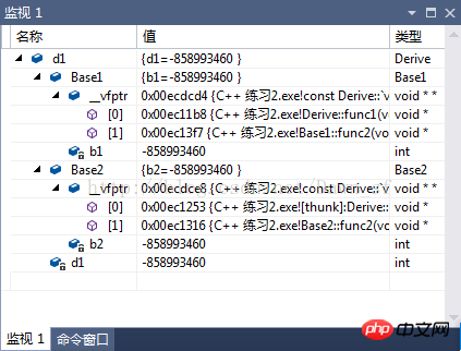 }登录后复制现在我们现在知道会有两个虚函数表,分别是Base1和Base2的虚函数表,但是呢!我们的子类里的fun3()函数怎么办?它是放在Base1里还是Base2里还是自己开辟一个虚函数表呢?我们先调一下监视窗口: