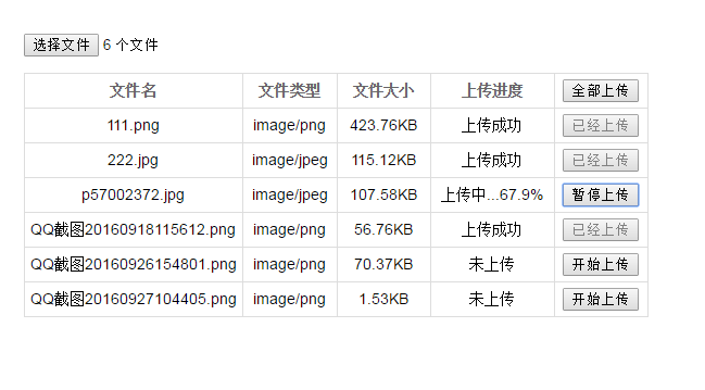 这个例子实现了文件断点续传的基本功能,不过手动的“暂停上传”操作还未实现成功,可以在上传过程中刷新页面来模拟上传的中断,体验“断点续传”、