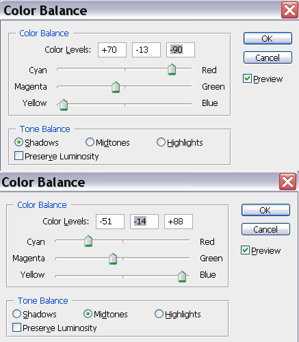 ■当图像让你感到平衡(既无过暗也不无亮区域)接着做色彩平衡:首先让图片有一点亮,我再次加点曝光,设定gamma范围1-1.5,这可能会太亮破坏对比度,但相信我没事,现在按“ctrl+b”,调出色彩平衡,我用下面的差数调出合适的色调。
