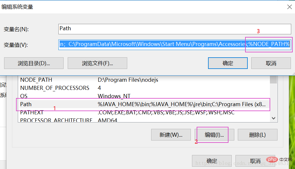 接着编辑Path,在变量值的尾部添加 ;%NODE_PATH%