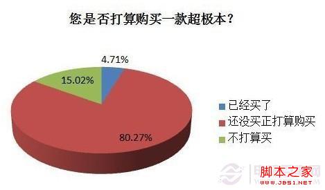 在一项名为“您是否打算购买一款超极本”的网上投票中,共有400多位网友参与了投票。其中:4.71%的网友已经购买了超极本;有80.27%的网友投给了“还没买、正打算购买”;另有15.02%的网友不打算购买超极本。