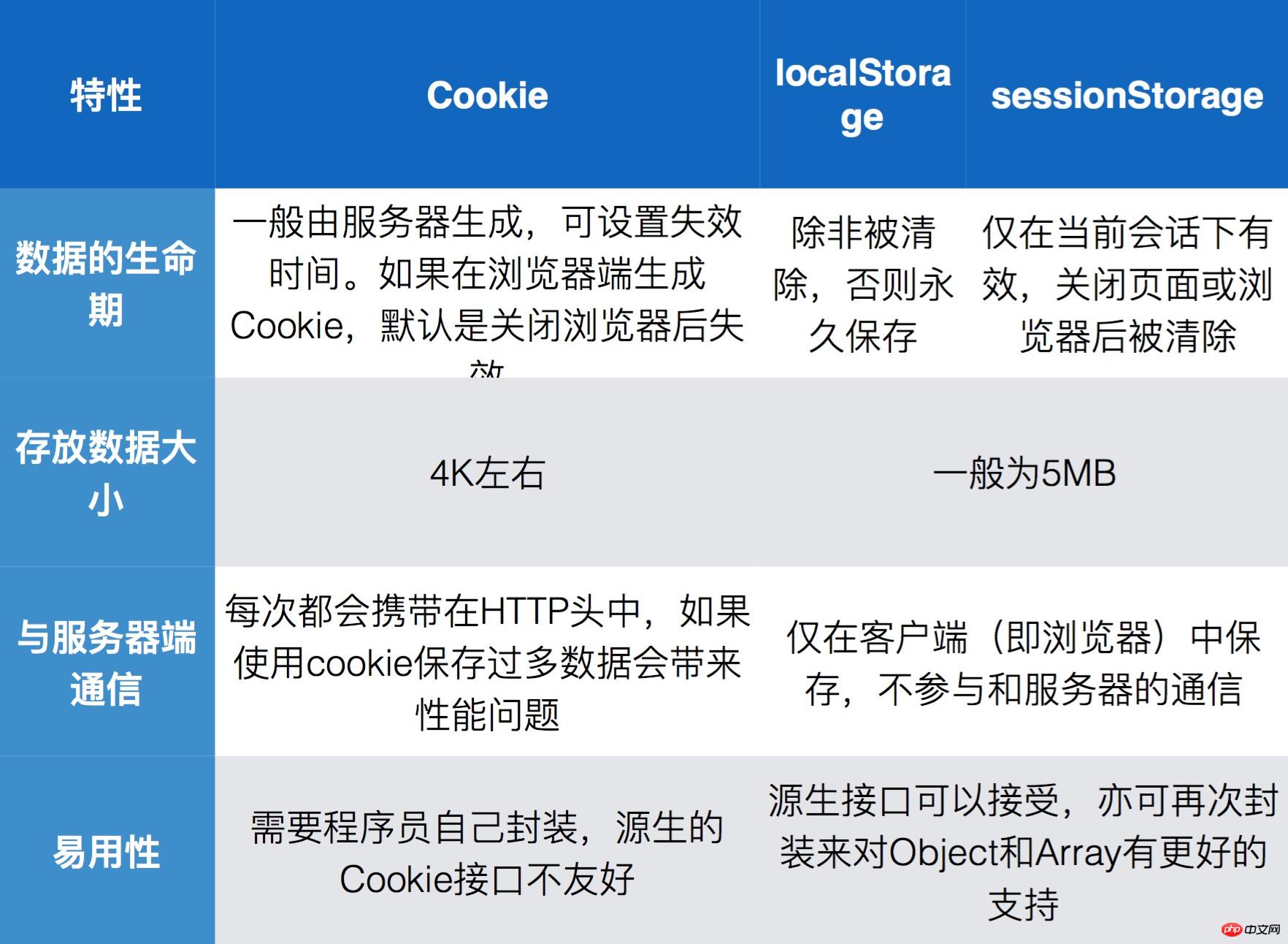 这里有张图片分析了 cookie 、 localStorage 、 sessionStorage 三者的区别