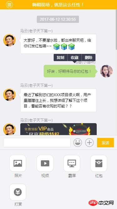这几天使用H5开发了一个仿微信聊天前端界面,尤其微信底部编辑器那块处理的很好,使用HTML5来开发,虽说功能效果并没有微信那么全,但是也相当不错了,可以发送消息、表情,发送的消息自动回滚定位到底部,另外可以对消息、图片、视频有不同的右键处理提示,还有打赏、占屏等操作。