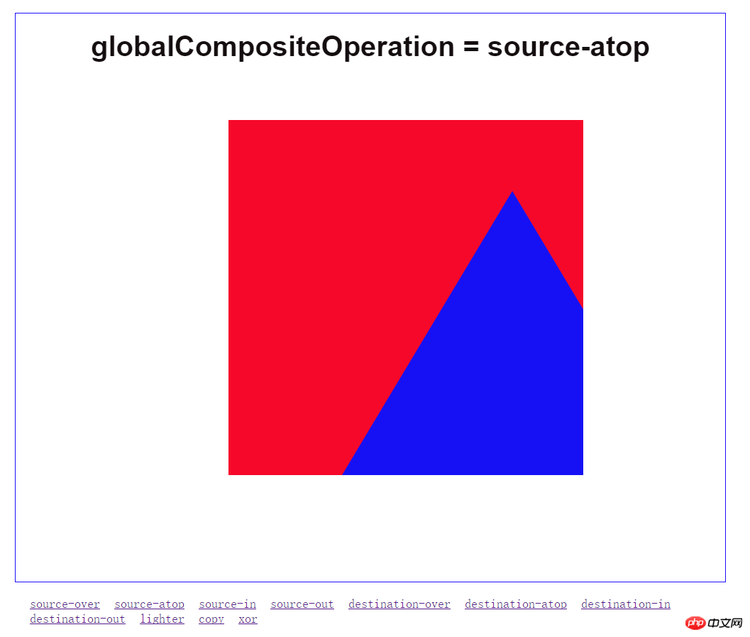 | destination-atop | 在源图像顶部显示目标图像。目标图像位于源图像之外的部分是不可见的 |