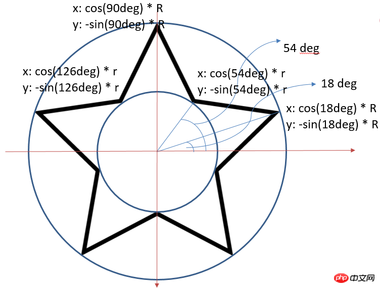 通过对五角星分析,我们可以确定各个顶点坐标的规律,这里需要注意的一点是:在canvas中,Y轴的方向是向下的。