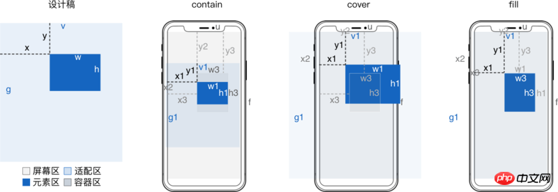 background-size值为contain时对应 contain 适配。background-size值为cover时对应 cover 适配。background-size值为100% 100%时对应 `fill 适配。background-position百分比和op意义相同