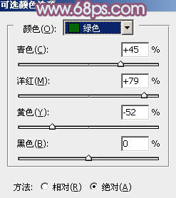 2、创建可选颜色调整图层,对黄、绿、白、黑进行调整,参数设置如图5 - 8,效果如图9。这一步给图片增加红褐色。