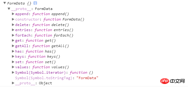 FormData 除了上面的创建新对象时直接将 form 作为参数传入外,还有其他的功能。网上大部分关于 FormData 介绍的文章都只提到了append()方法,那么FormData 对象到底有些什么方法呢?我们console 一下就知道: