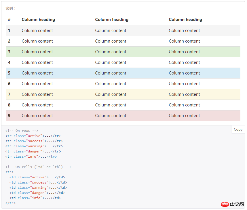 表格行显示的样式,通过设置tr的class属性值来控制,常用属性值有.info/.success/.warning/.active/.danger