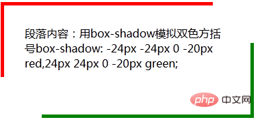 <div class="decorator">段落内容:用box-shadow模拟双色方括号box-shadow: -24px -24px 0 -20px red,24px 24px 0 -20px green; </div>