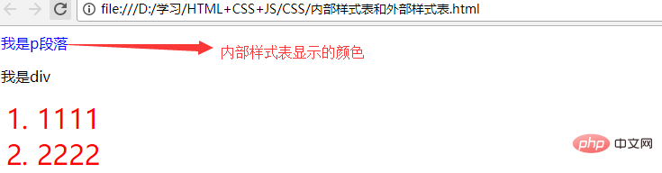 结论:内部样式表和外部样式表使用就近原则,即谁写在下面以谁为准。