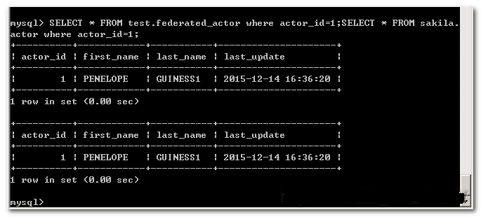 USE test; update federated_actor set last_name='GUINESS1' where actor_id=1; SELECT * FROM test.federated_actor; SELECT * FROM sakila.actor;