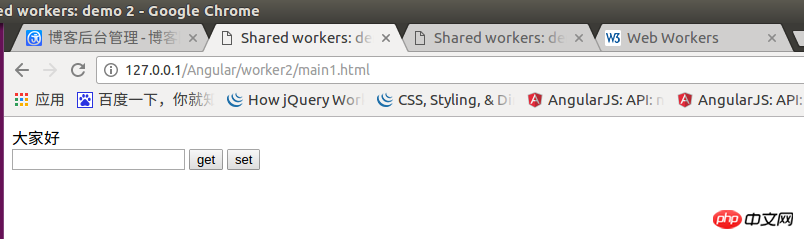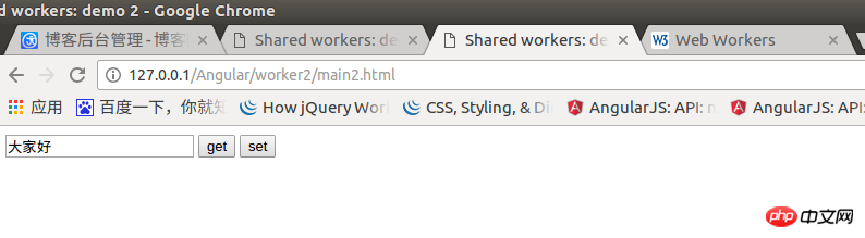 }登录后复制这里分析一波,我们在main1.html的文本框输入数据,点击set,然后在main2.html中点击get法现能够获取到我们在main1.html中设置的数据,这说明我们的sharedWorker事实上是单例的,就像java中的static类一样,不管new多少个,实际上只有一个,这样我们的不同线程就可以共享到sharedWorker中的数据了。这里把图给上,记得有篇文章没给图,然后有人给我建议了,问能不能给图。