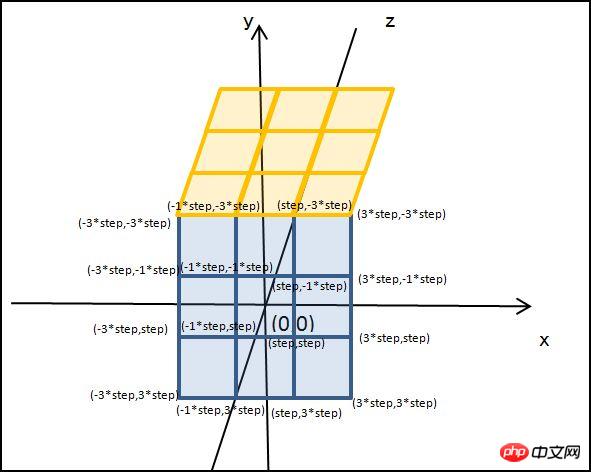 魔方分为6个面,先看一下最前面的一面,如果以立方体的中心作为3D坐标系的中心,那么9个小矩形的各个定点所对应的坐标如下图所示