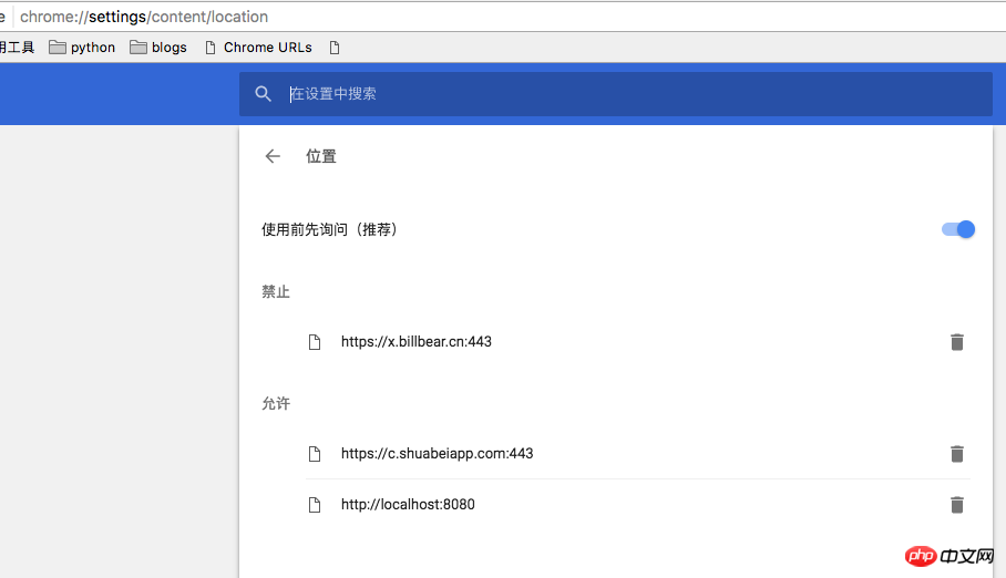 无论用户拒绝还是允许授权,该站点都会被浏览器缓存下来,下次访问的时候就不会再次询问用户了,除非用户手动移除该规定。在 chrome 中移除规则的地址在设置里面,如下图: