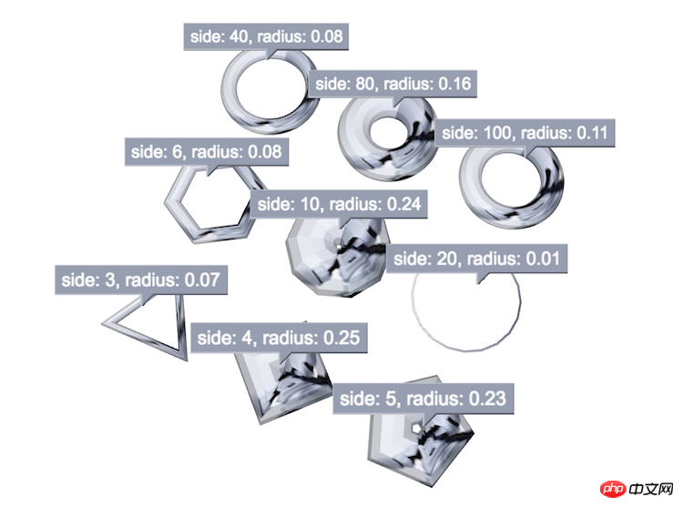 4. torus:圆环,可通过 shape3d.side 分成多片,结合 shape3d.side.from 和 shape3d.side.to 可形成半圆环等
