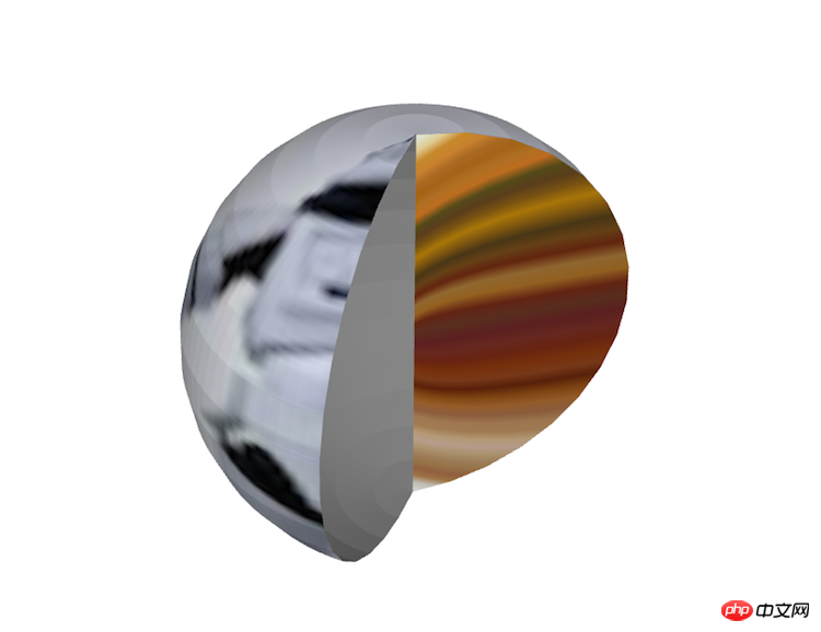 就如上图所示,球被裁切掉了一部分,被裁切的两个面可以单独控制,通过 shape3d.from.* 和 shape3d.to.* 两组参数就可以单独控制两面的显示效果,在上图中,我通过 shape3d.to.visible 将 to 的面隐藏了,将 from 面通过 shape3d.from.image 设置了新的贴图,具体代码如下: