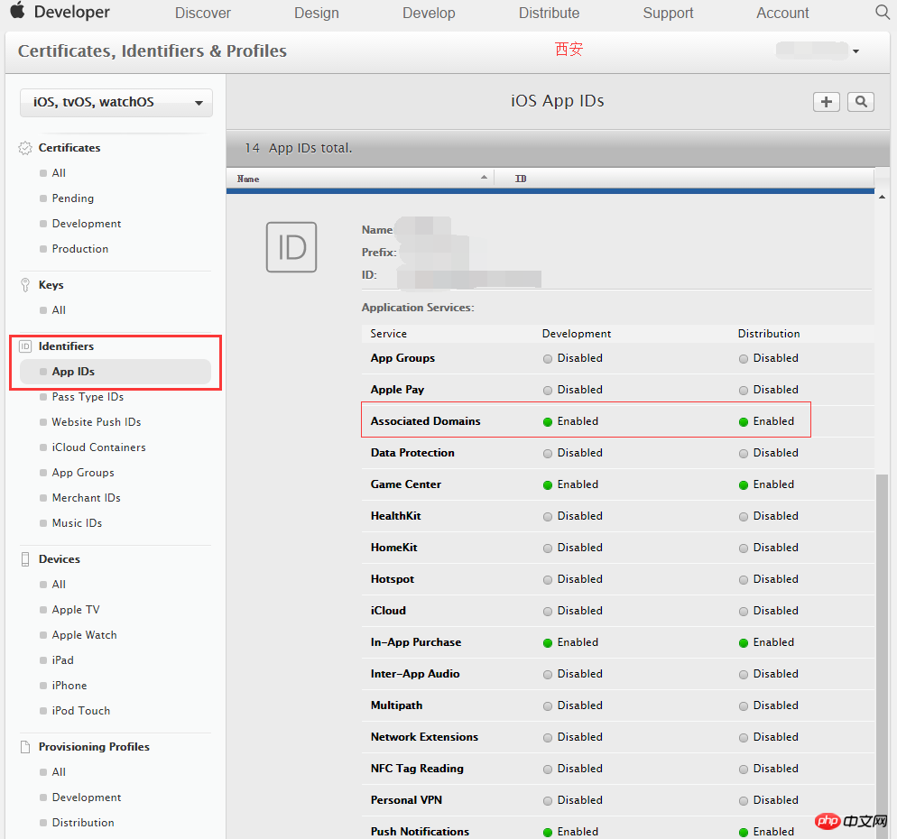 Identifiers - App IDs –Edit 然后开启打钩 Associated Domains 后保存,配置地址:https://developer.apple.com/account/ios/identifier/bundle