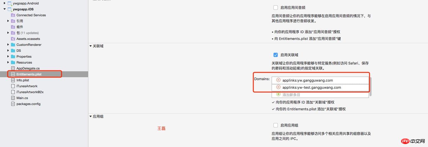 如果你是Xamarin项目的话,需要选择Entitlements.plist配置关联域,如图: