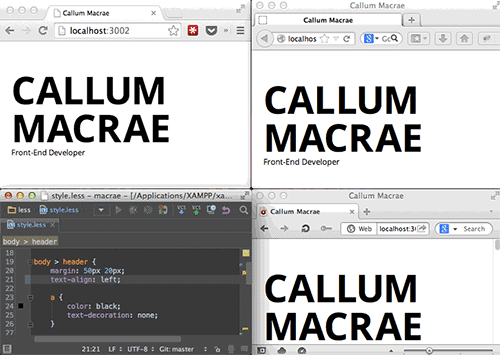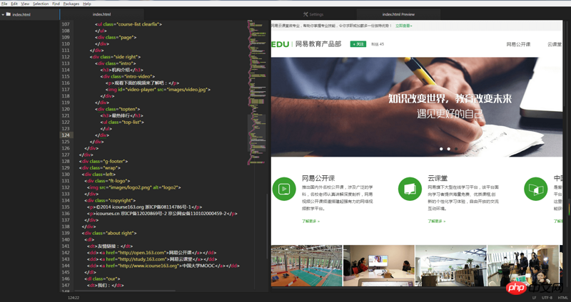 上述三者都是大名鼎鼎的编辑器,插件众多,功能强大,为前端开发人员们在工作中立下汗马功劳,也深受开发人员们的喜爱,因此也是教程众多,我就不再多说了。google一下,你就知道如何使用它们的及时预览功能了。但是这些工具的及时预览有一点不爽:预览界面内嵌在编辑器界面内,减小了对整张网页的视觉效果,Atom和Brackets都存在这样的问题(当然这也不算是问题了,全看个人喜好)。如Atom编辑器使用atom-preview-html实现的效果: