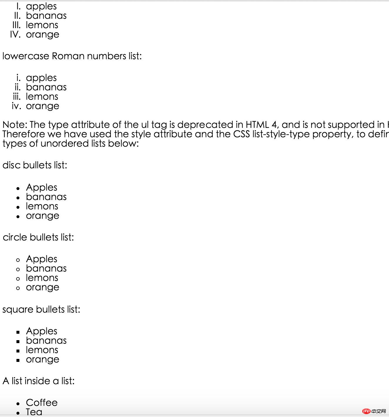 <p><b>Note:</b> The type attribute of the ul tag is deprecated in HTML 4, and is not supported in HTML5. Therefore we have used the style attribute and the CSS list-style-type property, to define different types of unordered lists below:</p>