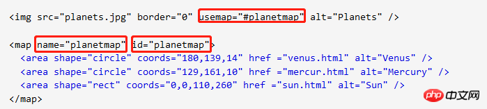 注:<img> 标签中的 usemap 属性与 <map> 元素 name 属性相关联,创建图像与映射之间的联系。<img> 中的 usemap 属性可引用 <map> 中的 id 或 name 属性(由浏览器决定),所以我们需要同时向 <map> 添加 id 和 name 两个属性。