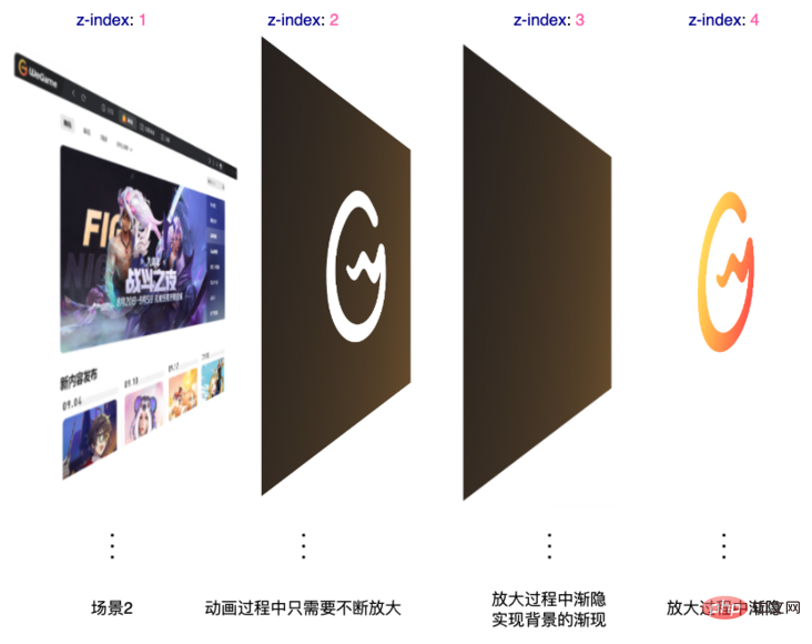 LOGO 放大到一定程度,开始渐隐,LOGO 背后的场景 2 逐渐渐现