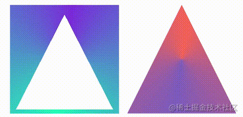 左边是利用 mask 实现遮罩后的图形,右边是利用 clip-path 切割后的图形,它们的效果叠加在一起,就能实现一个边框三角形。