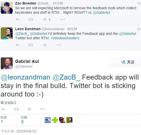 那么正式版上还会有吗?Win10预览计划负责人Gabriel Aul在Twitter上回答网友提问时透露,反馈应用将在正式版中得到保留,并且他的Twitter也将继续为大家服务。