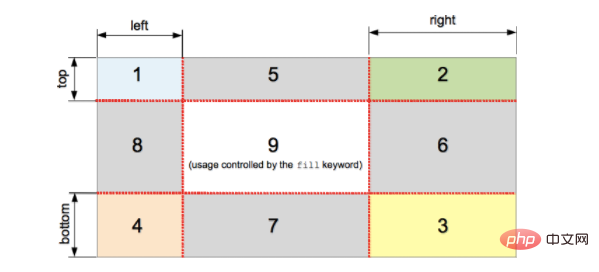 该属性规定图像的上、右、下、左侧边缘的向内偏移,图像被分割为九个区域:四个角、四条边以及一个中间区域。除非使用了关键词 fill,否则中间的图像部分会被丢弃。如果省略第四个数值/百分比,则与第二个值相同。如果省略第三个值,则与第一个值相同。如果省略第二个值,则与第一个值相同。