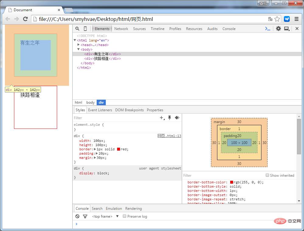 </html>登录后复制上面的代码中,我们对div标签设置了边距等信息。打开google浏览器,按住F12,显示效果如下:
