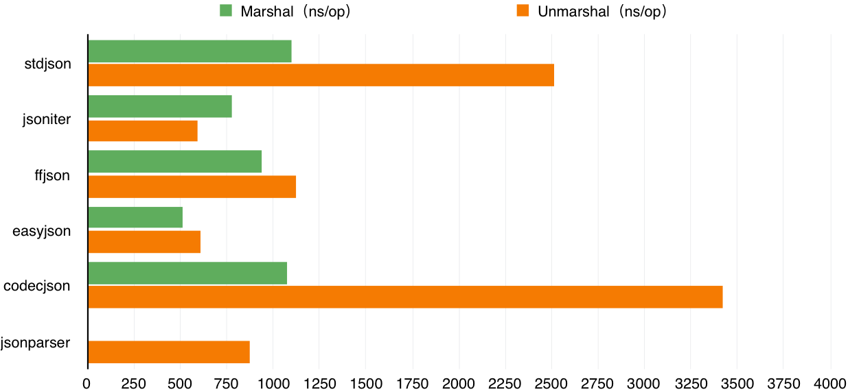 BenchmarkMarshalStdJson-4 1000000 1097 ns/op BenchmarkMarshalJsonIterator-4 2000000 781 ns/op BenchmarkMarshalFfjson-4 2000000 941 ns/op BenchmarkMarshalEasyjson-4 3000000 513 ns/op BenchmarkMarshalCodecJson-4 1000000 1074 ns/op BenchmarkMarshalCodecJsonWithBufio-4 1000000 2161 ns/op BenchmarkUnMarshalStdJson-4 500000 2512 ns/op BenchmarkUnMarshalJsonIterator-4 2000000 591 ns/op BenchmarkUnMarshalFfjson-4 1000000 1127 ns/op BenchmarkUnMarshalEasyjson-4 2000000 608 ns/op BenchmarkUnMarshalCodecJson-4 20000 122694 ns/op BenchmarkUnMarshalCodecJsonWithBufio-4 500000 3417 ns/op BenchmarkUnMarshalJsonparser-4 2000000 877 ns/op golang_json_performance