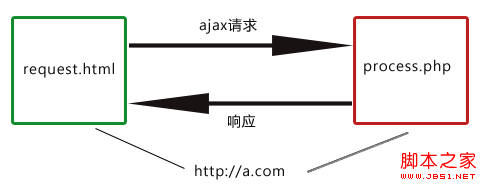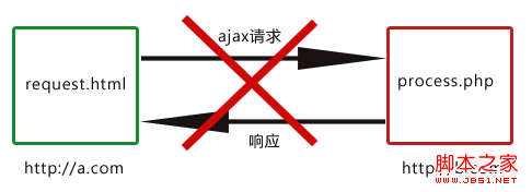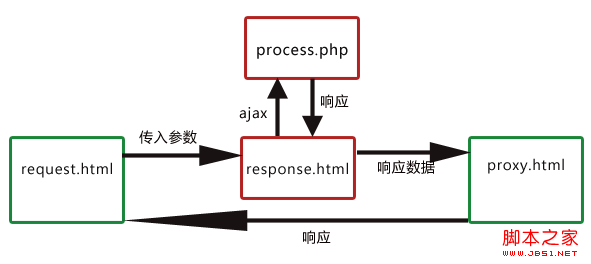 要实现域a.com的request.html请求域b.com的process.php,可以将请求的参数通过URL传给response.html,由response.html向process.php发出真正的ajax请求(response.html与process.php都属于域b.com),然后将返回的结果通过URL传给proxy.html,最后由于proxy.html与request.html是在同一域下,所以可以在proxy.html利用window.top将结果返回给request.html完成跨域通信。