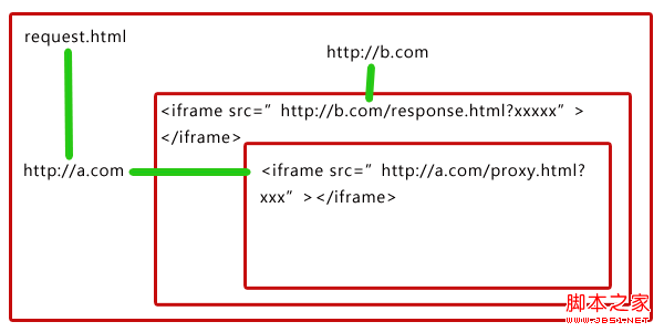 如下图所示:域a.com的页面request.html(即http://a.com/request.html)里面嵌套了一个iframe指向域b.com的response.html,而response.html里又嵌套了域a.com的proxy.html。