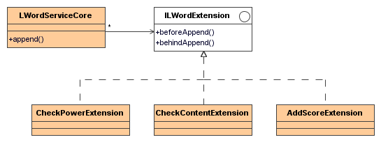 想要实现插件方式,可以建立接口!使用接口的好处是可以将定义和实现隔离,另外就是实现多态。我们建立一个留言扩展接口ILWordExtension,该接口有两个函数beforeAppend和behindAppend。权限校验、内容检查、加分这些功能可以看作是实现ILWordExtension接口的三个实现类,主业务逻辑就依次遍历这三个实现类,来完成次业务逻辑。如图1所示: