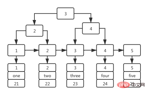 从上面这张示例图也可以看到,这棵B+树最下面的叶子节点存储了所有的元素,并且是按顺序存储的,而非叶子节点仅存储索引列的值。