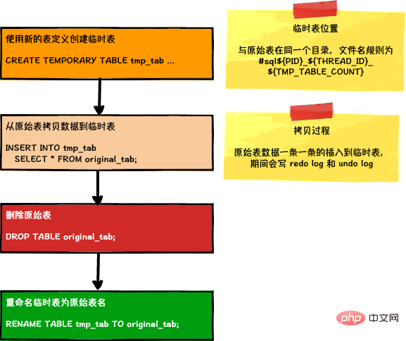 | COPY | 最原始的方式,所有的存储引擎都支持,不使用 Online DDL,操作时会创建临时表,执行全表拷贝和重建,过程中会写入 Redo Log 和大量的 Undo Log,需要添加读锁,非常低效 |