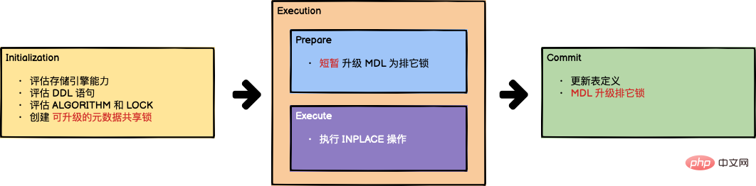 这个阶段会 准备 并 执行 DDL 语句,根据 阶段 1 评估的结果来决定是否将元数据锁升级为 排它锁 (X),如果需要升级为排它锁,则只在 DDL 的 准备阶段 短暂的添加排它锁。