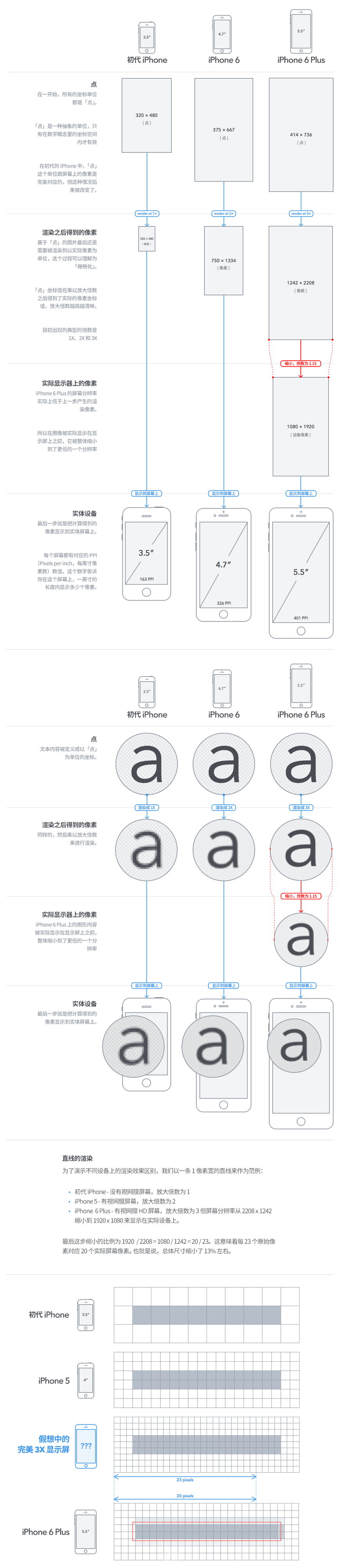这个缩小 17% 的比例是这么来的呢?来看 Stack Overflow 上的回答:iPhone 6 Plus resolution confusion: Xcode or Apple’s website? ,简单来说就是为了切图的放大倍数、实际渲染像素都是正整数。