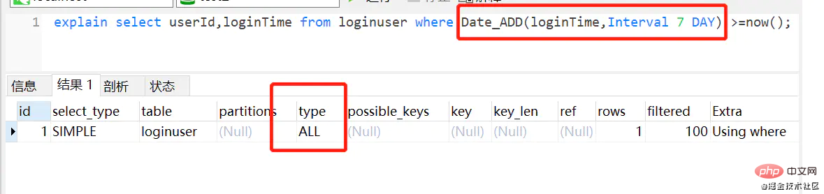 explain select userId,loginTime from loginuser where loginTime >= Date_ADD(NOW(),INTERVAL - 7 DAY);复制代码