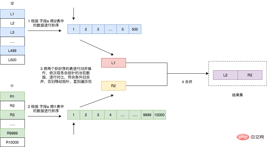 需要注意的是,如果连接的字段已经有索引,也就说已经排好序的话,可以直接进行归并操作,但是如果连接的字段没有索引的话,则它的执行过程如下图所示。