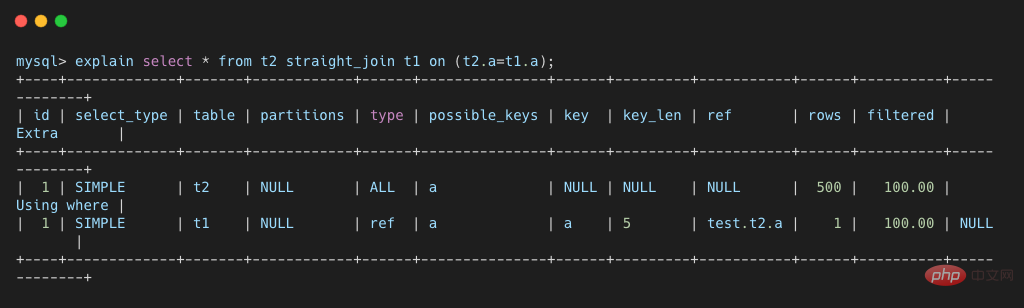 select * from t2 straight_join t1 on (t2.a=t1.a);复制代码