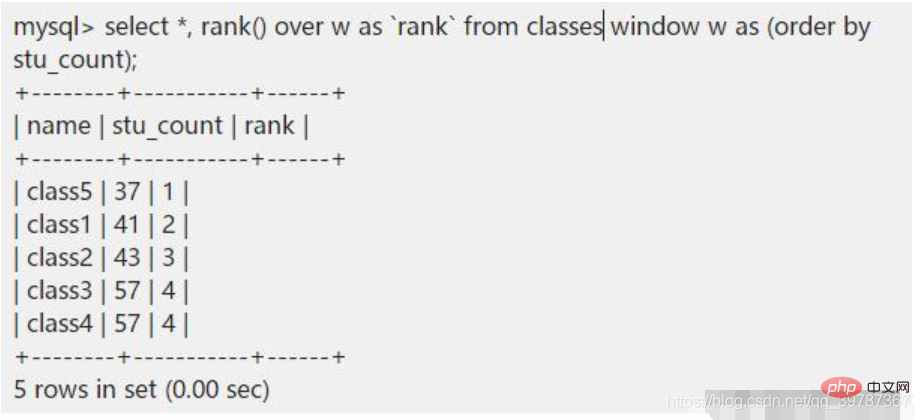 说明:在这里创建了名为 w 的 window,规定它对 stu_count 字段进行排序,然后在 select 子句中对 w 执行 rank() 方法,将结果输出为 rank 字段。