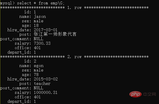 当我们的字段特别多的时候 结果的排版可能会出现凌乱现象 我们可以在查询语句末尾 加上G来规范查询结果