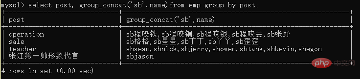 select post,group_concat('hahha',name) from emp group by post;登录后复制还可以拼接