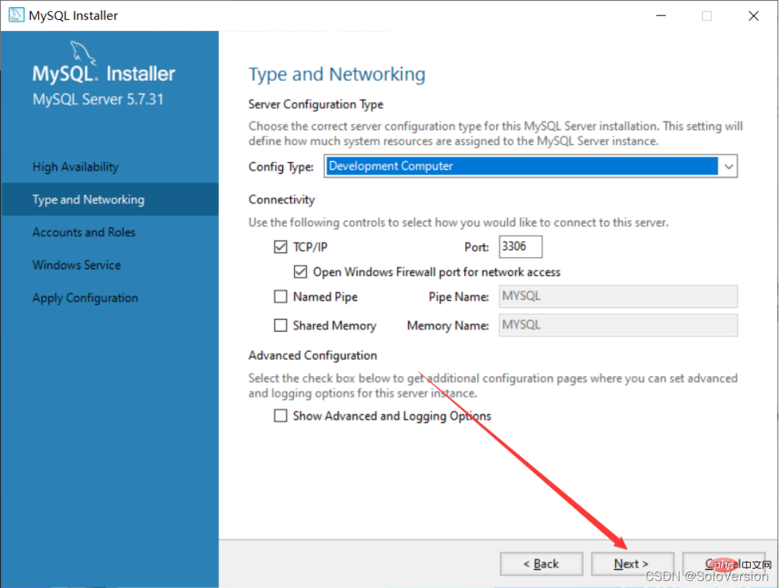 3. 先选中“MySQL Server 5.7.31” ,之后点击下方的蓝色“Advanced Options”