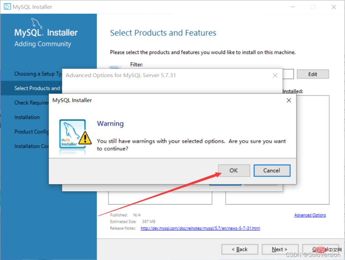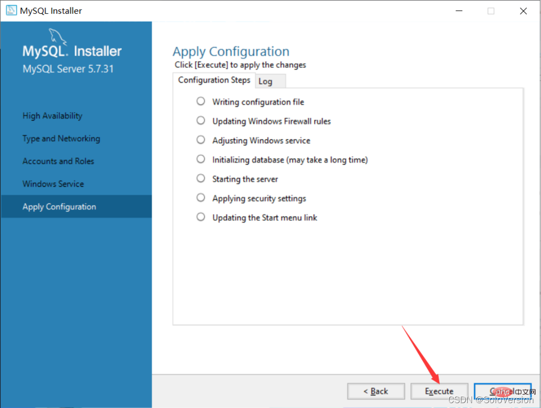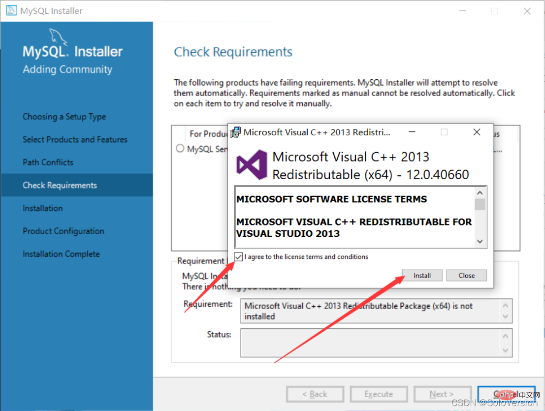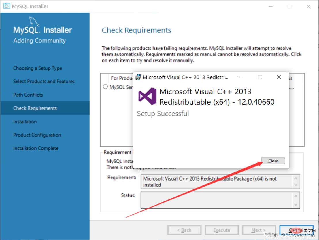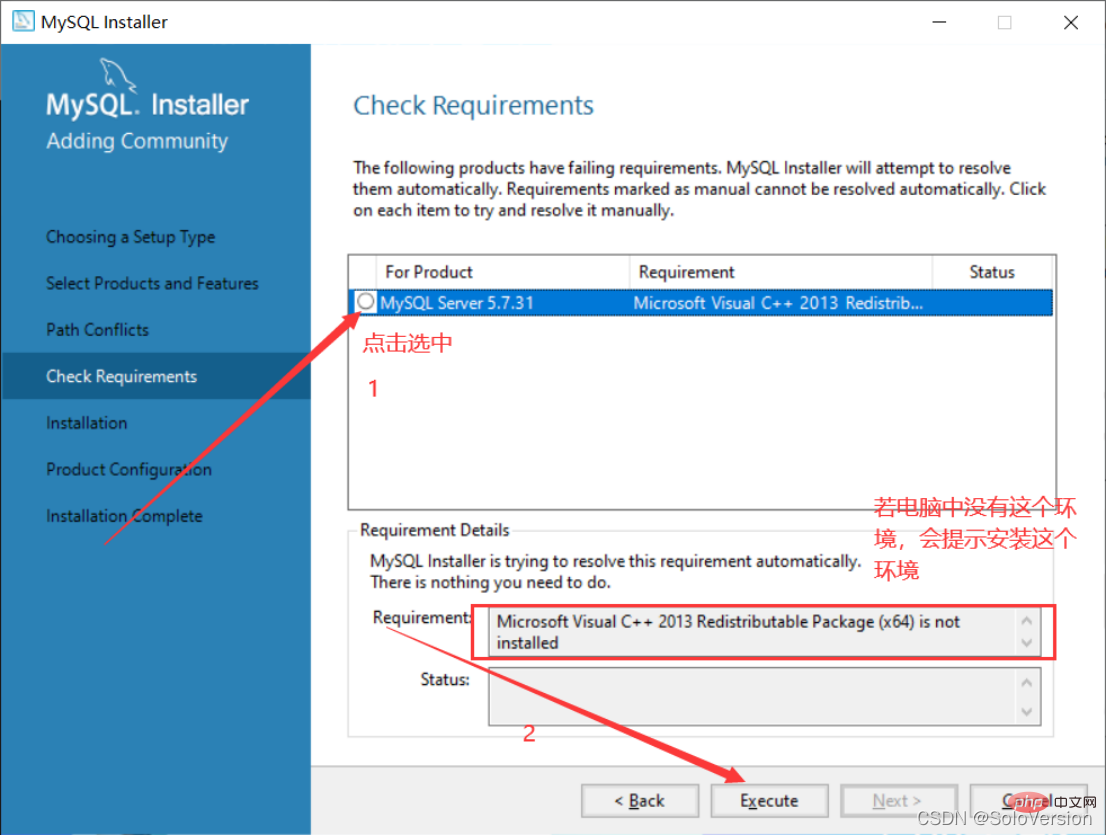 9. 先选中“MySQL Server5.7.31”,若电脑中没有这个环境,会提示安装“Microsoft Visual C++ 2013”环境,点击“Execute”