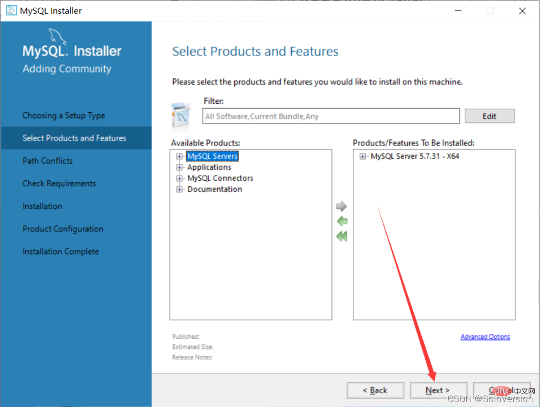 依次点开“MySQL Servers”、“MySQL Servers”、“MySQL Servers 5.7”、“MySQL Servers 5.7.31 -64”,然后点击绿色箭头将选中的版本移植到右边选中框中