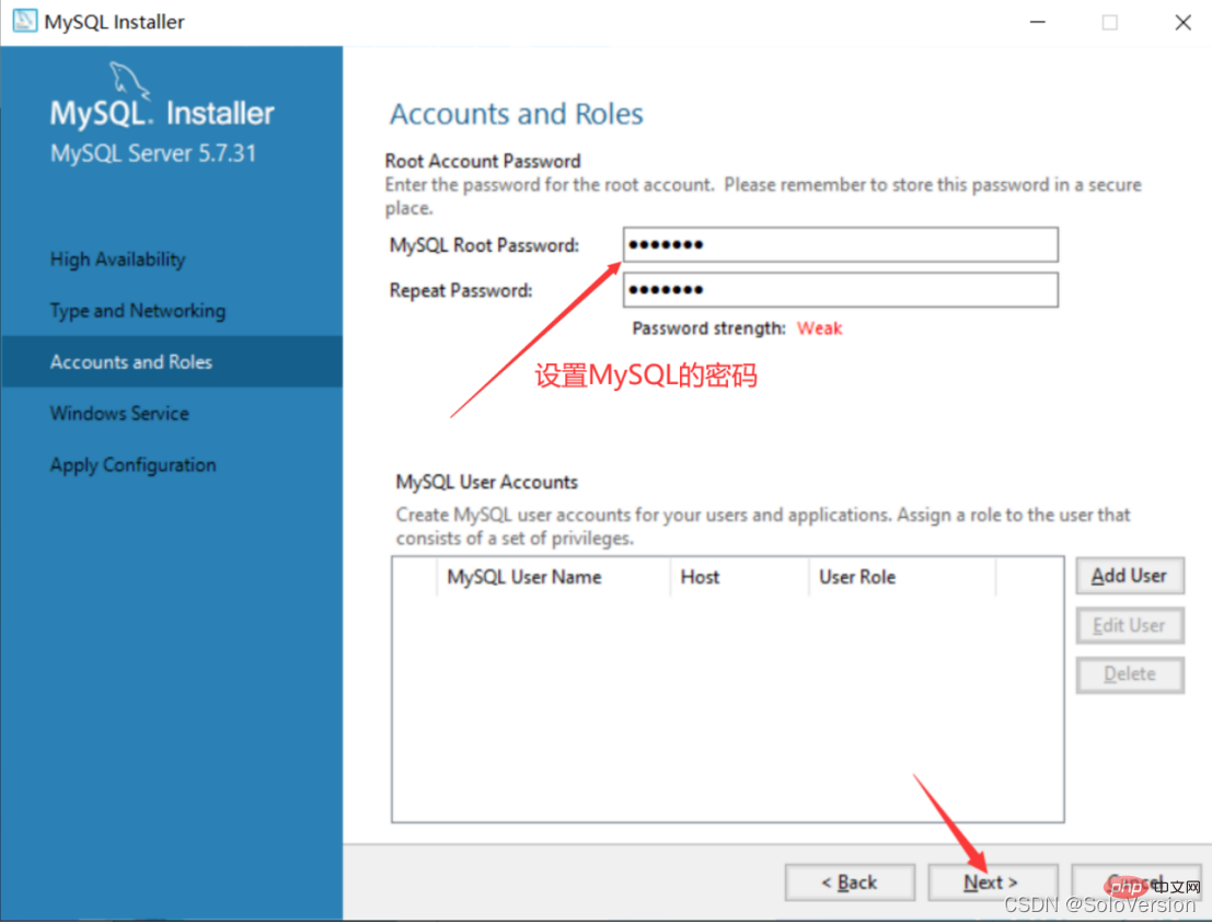19. 这里需要设置MySQL的密码,不需要太复杂,设置完了直接点击“Next”