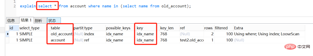 从explain结果可以发现:先全表扫描 account,然后逐行执行子查询判断条件是否满足;显然,这个执行计划和我们预期不符合,因为并没有走索引。